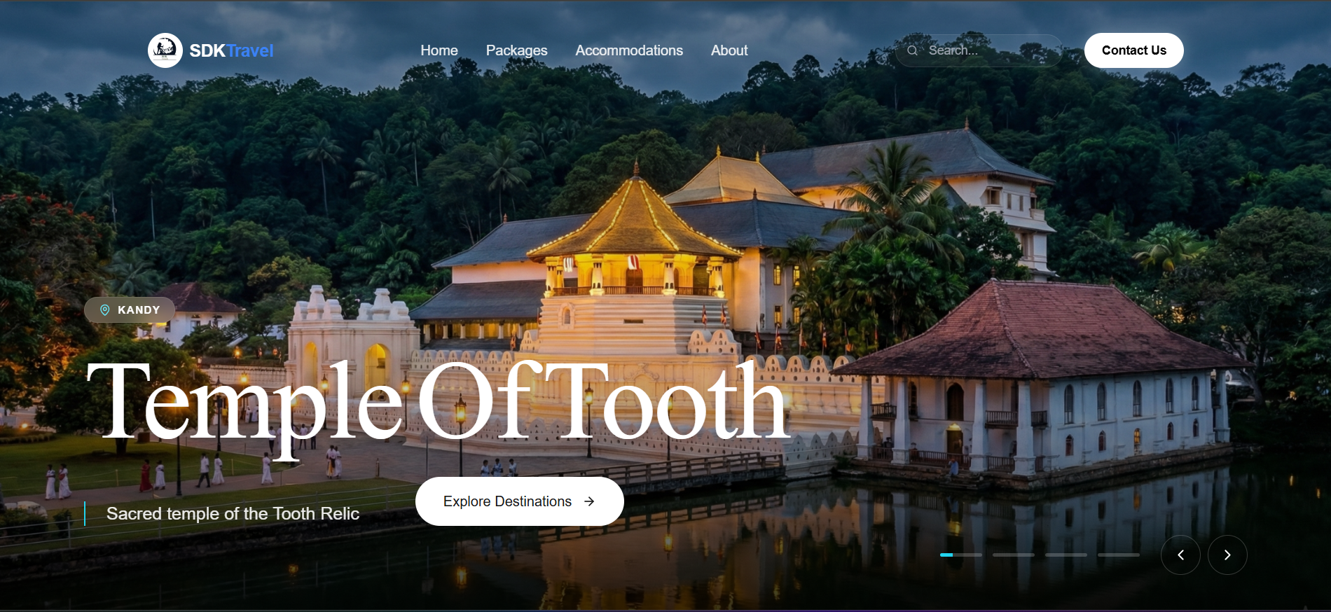 SDK Travels is a modern travel and tour booking platform developed using the MERN (MongoDB, Express, React, Node.js) stack. It allows users to explore Sri Lanka tour packages, accommodations, and make online bookings through a user-friendly dashboard.